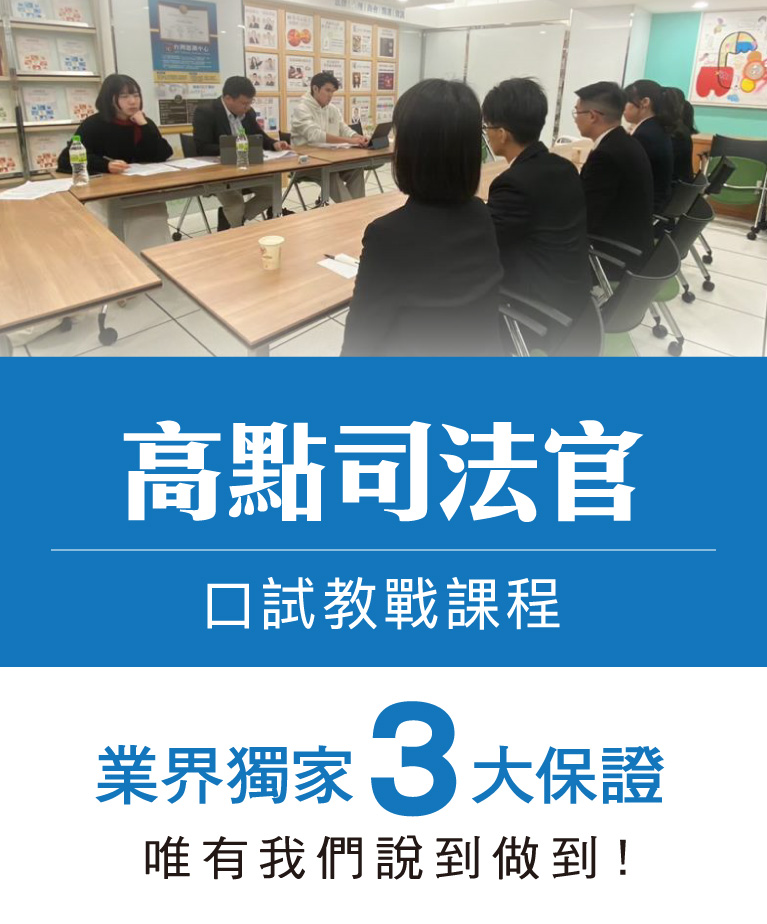 司法官口試講座除了講解書審資料書寫的方式,也介紹如何運行讀書會,對於準備三試提供非常多有用的指引!口試評分標準也包括儀態、人格特質和應變能力,所以個人長時間的專注度就很重要,如果稍有閃失,可能就會聽不懂或搞錯口試委員的題目,這部分在高點的模擬口試中就可以很完整的模擬到,因為口試模擬約70分鐘,且口試委員也會針對大家的答題,重點式的提示與檢討,對我來說幫助很大!